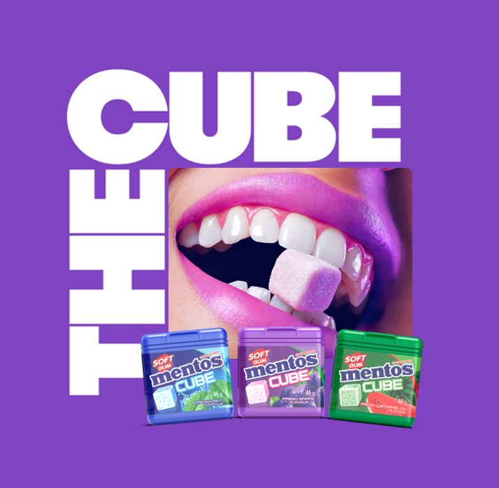 NEW! Mentos Cube - the new soft texture gum! Enjoy a long-lasting burst of flavour in every chew.